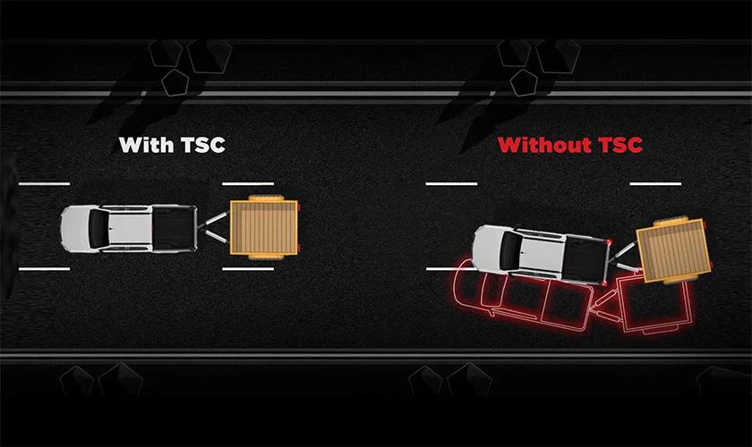 TSC will apply brakes to individual vehicle wheels to help bring the trailer safely back under control.